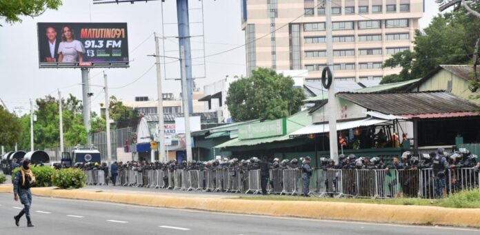 La presencia de las autoridades se extiende a zonas cercanas como el Centro Olímpico Juan Pablo Duarte, el sector Miraflores y varias calles aledañas. El contingente incluye unidades caninas (K9) y un camión antimotines.