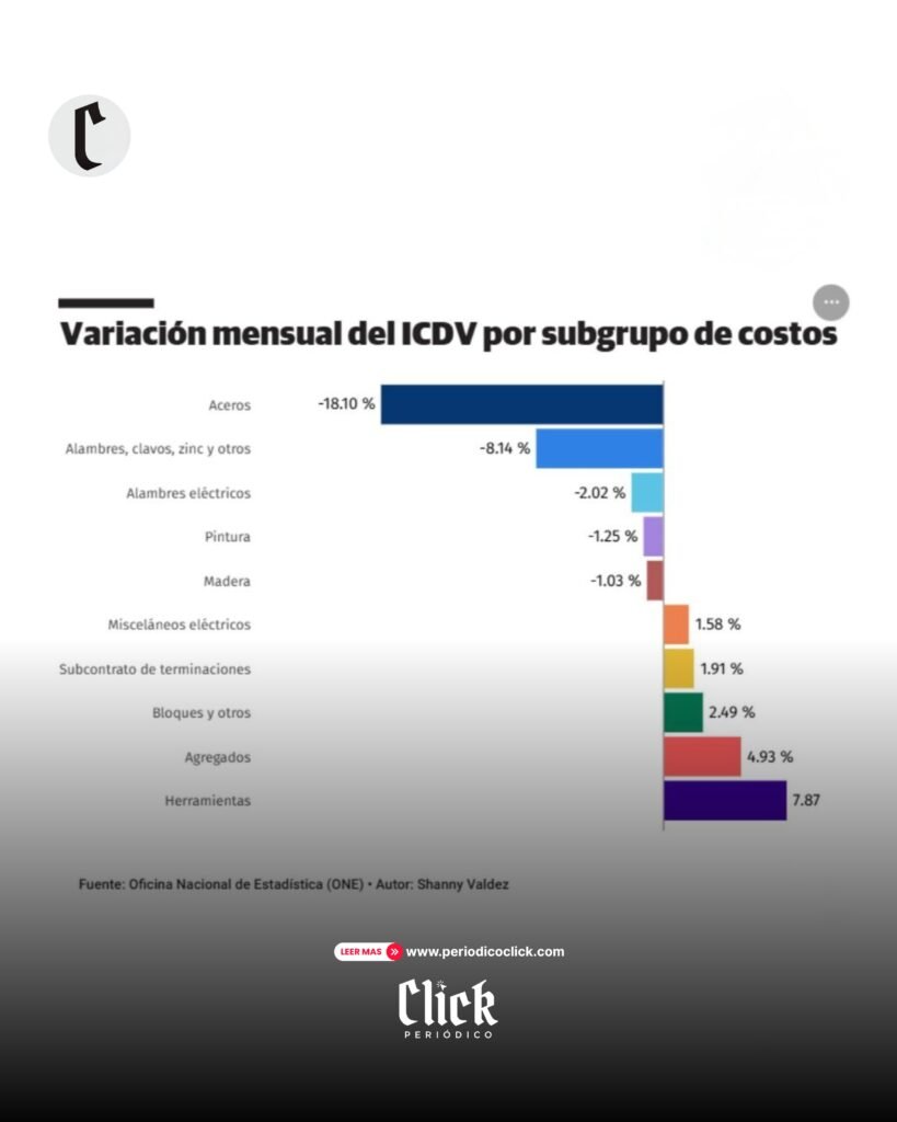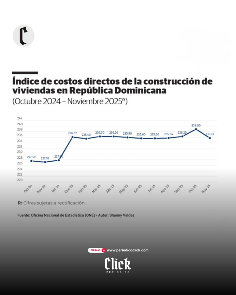 De acuerdo con el Índice de Costos Directos para la Construcción de Viviendas (ICDV) —instrumento que mide mensualmente el costo de edificar casas, apartamentos y proyectos habitacionales— el indicador se ubicó en 235.73 en noviembre, lo que representa un aumento interanual de 3.74 %, en comparación con 227.22 registrados en noviembre del año pasado.