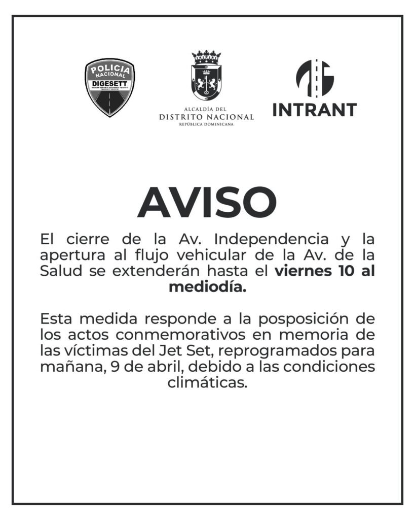 Santo Domingo, DN – La Alcaldía del Distrito Nacional, el Instituto Nacional de Tránsito y Transporte Terrestre (INTRANT) y la Dirección General de Seguridad de Tránsito y Transporte Terrestre (DIGESETT) extendieron el cierre de un tramo de la avenida Independencia y la apertura al tránsito vehicular de la avenida de la Salud hasta el próximo viernes al mediodía.