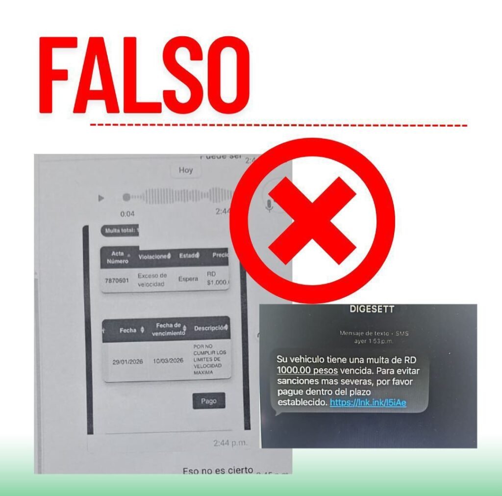 De acuerdo con reportes recibidos, algunos ciudadanos han informado sobre mensajes que incluyen enlaces sospechosos o supuestos “descuentos por multas”. Ante esta situación, la institución reitera nuevamente que la DIGESETT no cobra multas ni envía enlaces a través de mensajes de texto, y que todos los procesos relacionados con sanciones de tránsito se realizan exclusivamente mediante los canales oficiales del Estado dominicano.