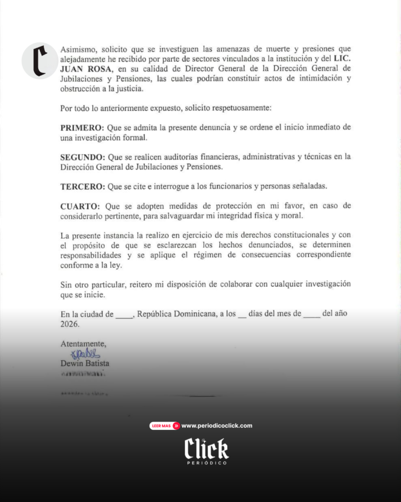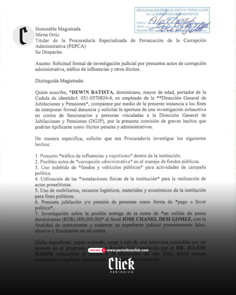 El ciudadano Dewin Batista depositó una solicitud formal de investigación ante la Procuraduría Especializada de Persecución de la Corrupción Administrativa (PEPCA), dirigida a la magistrada Mirna Ortiz, por alegados actos irregulares dentro de la Dirección General de Jubilaciones y Pensiones.