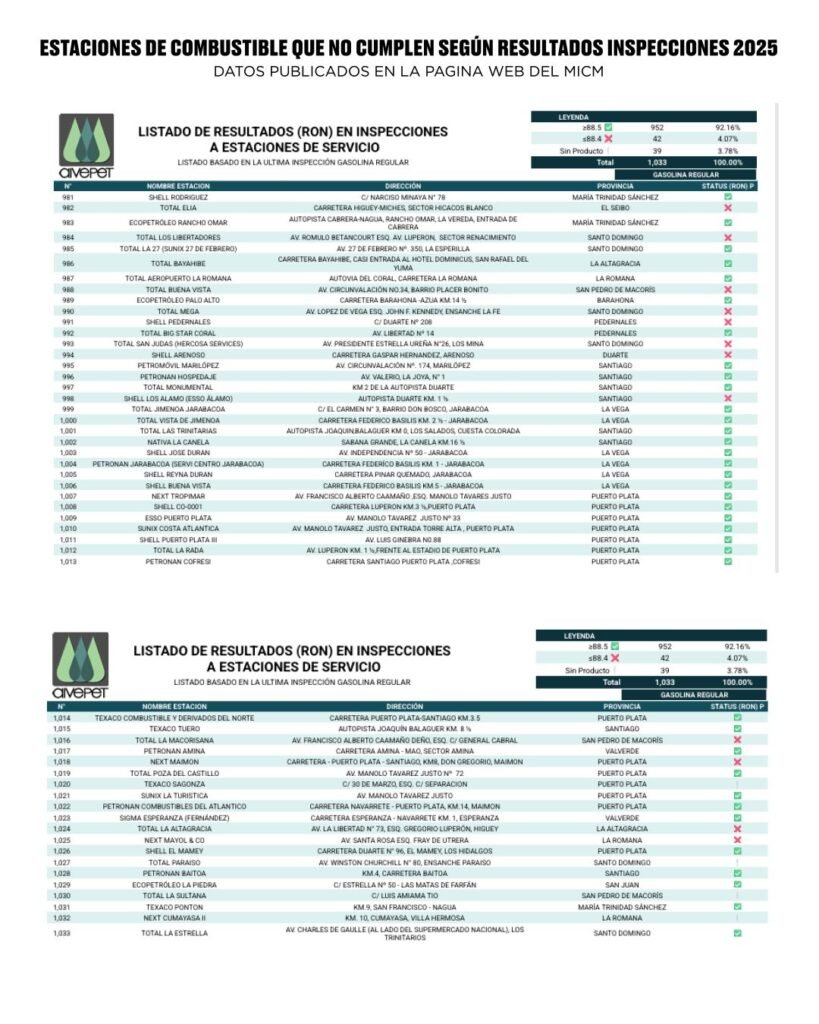De acuerdo con los resultados publicados en el portal oficial del ministerio, tras auditar 1,033 expendios a nivel nacional, se detectó que 101 estaciones despachan gasolina Premium con bajo octanaje, mientras que otras 42 presentan deficiencias en la gasolina Regular. En total, las irregularidades afectan a establecimientos distribuidos en el Distrito Nacional y otras 23 provincias del país.