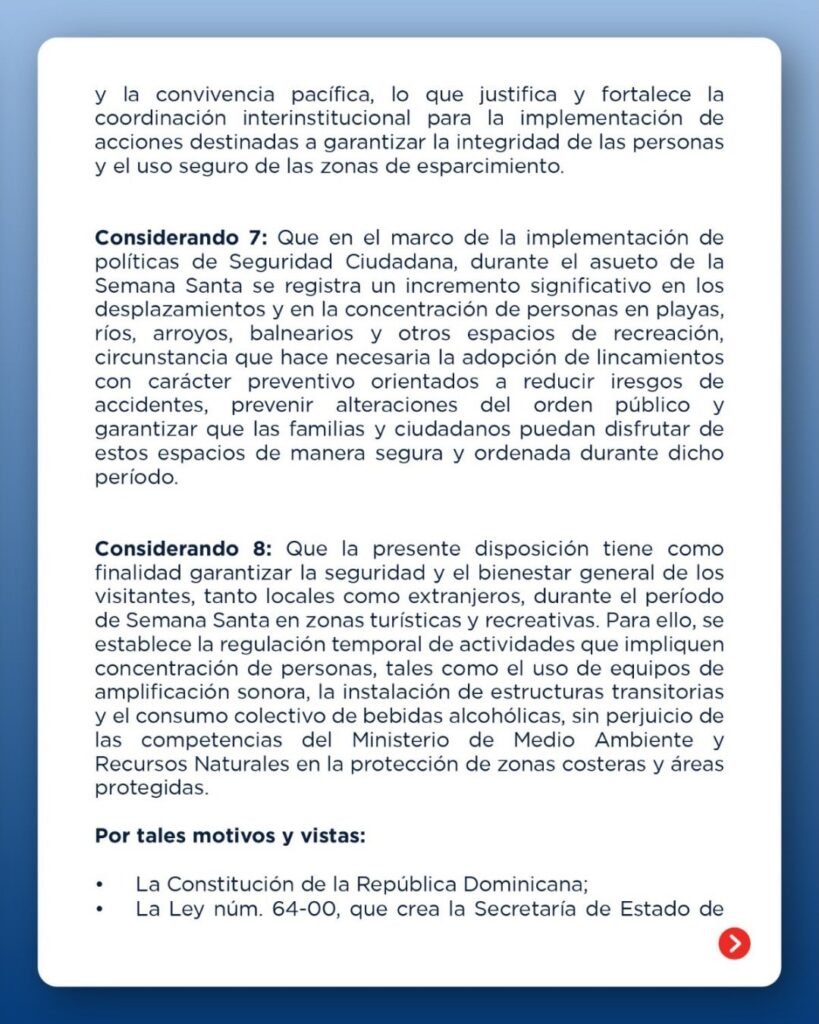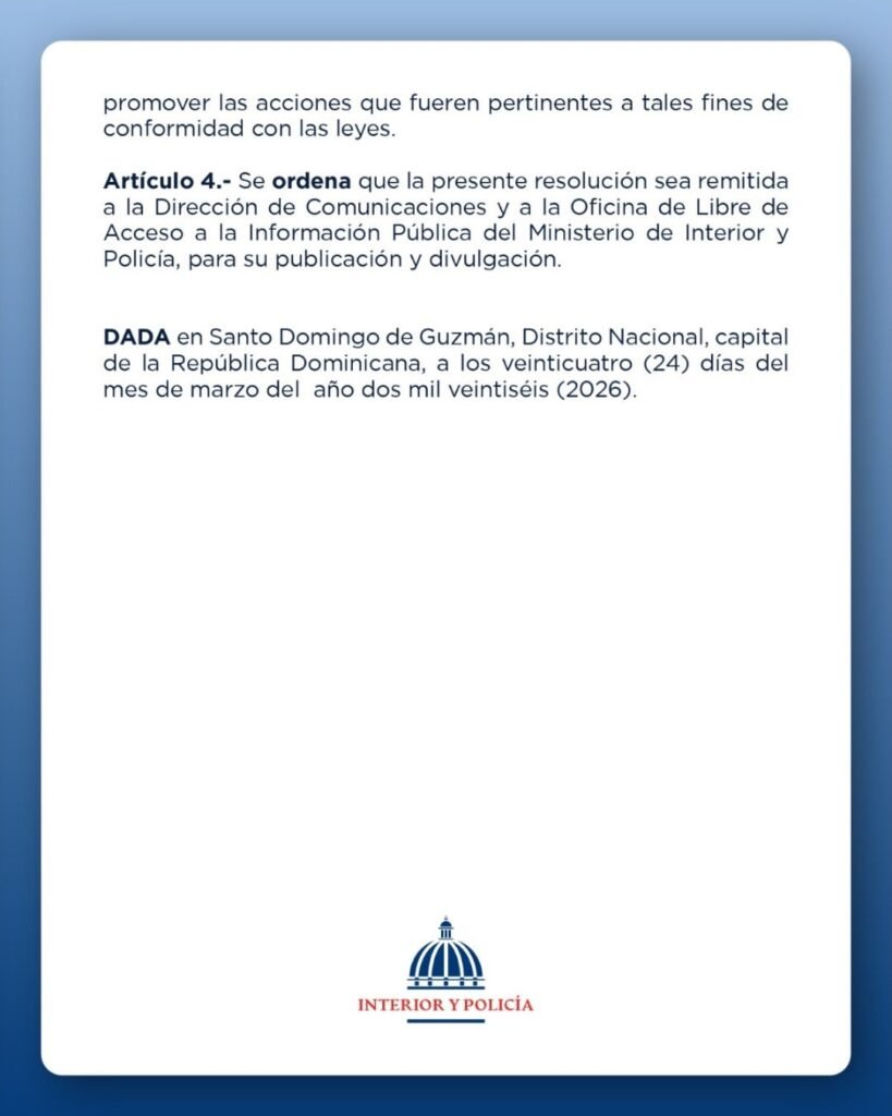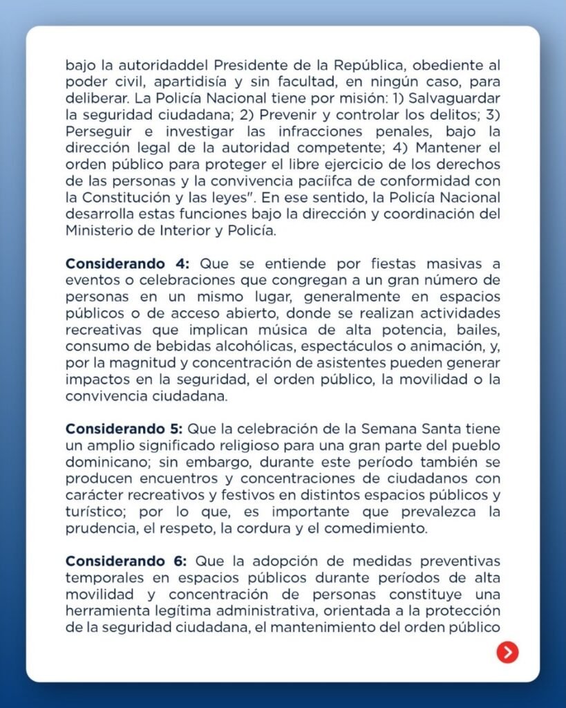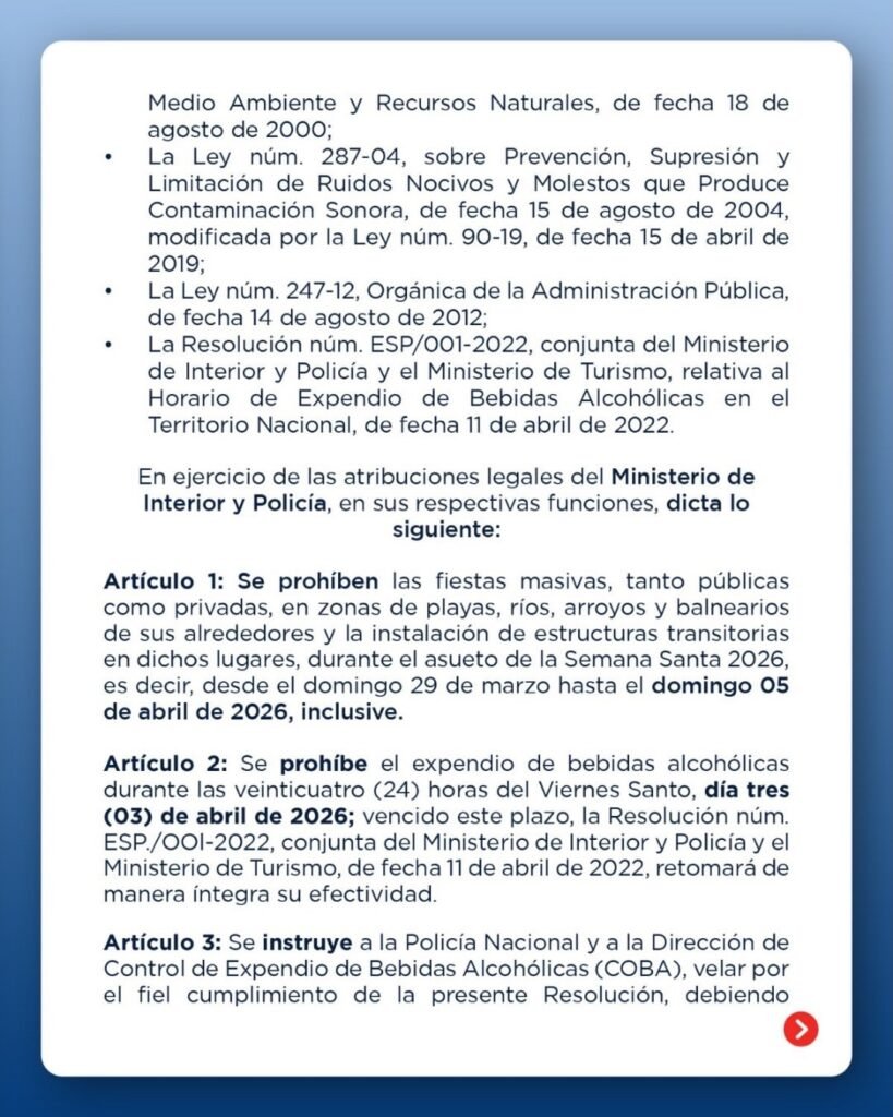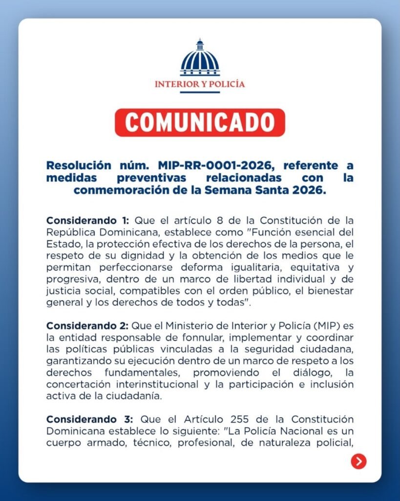 El Ministerio de Interior y Policía emitió la Resolución núm. MIP-RR-0001-2026, mediante la cual establece una serie de medidas preventivas de cara a la conmemoración de la Semana Santa en el país.