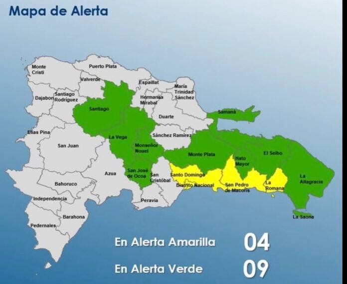 Mientras que en alerta verde se encuentran: Monte Plata, La Vega, La Altagracia, Santiago, San José de Ocoa, Hato Mayor, El Seibo, Samaná y Monseñor Nouel.