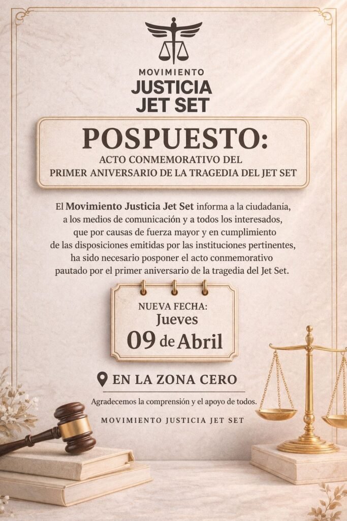 SANTO DOMINGO.– El Movimiento Justicia Jet Set anunció este miércoles la posposición del acto conmemorativo del primer aniversario de la «Tragedia del Jet Set», debido a las intensas lluvias que afectan el territorio nacional y en cumplimiento con las disposiciones de seguridad emitidas por las autoridades competentes.