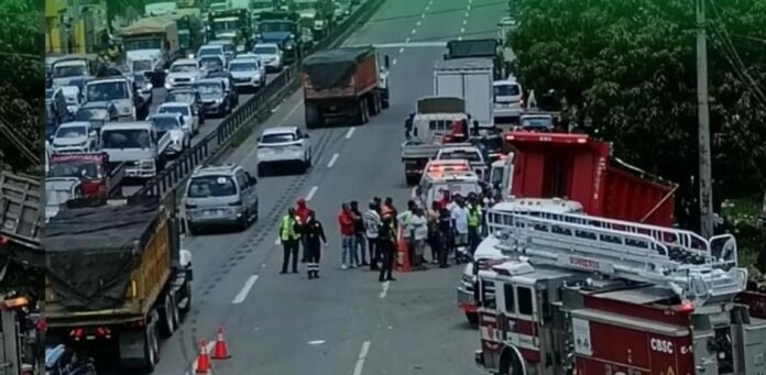El informe preliminar de los hechos indica que el conductor de un camión volteo perdió el control del vehículo, deslizándose hacia el área verde de la vía. En su trayectoria, el pesado vehículo impactó y arrastró una motocicleta que circulaba por la zona.